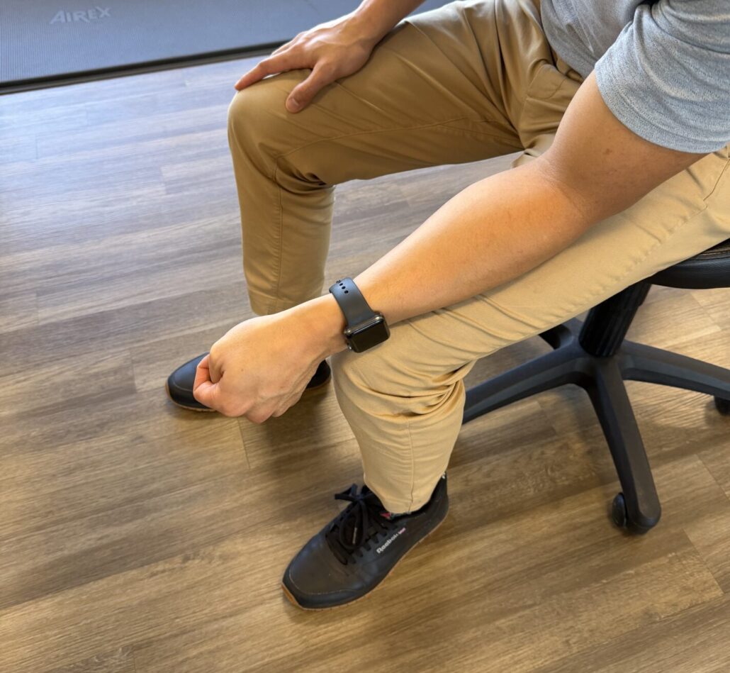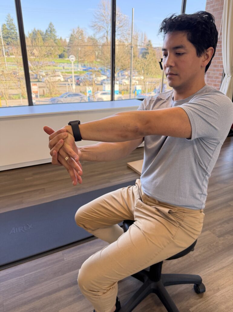 Stretch: Thumb and wrist stretch — gently place thumb inside a loose fist, and tilt the wrist away from your thumb. Hold 30 seconds.
