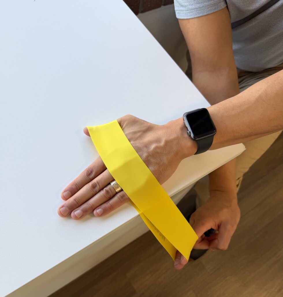 Strengthening (after an initial period of rest and/or bracing): Thumb extension — use a light resistance band around thumb and fingers. Slowly move thumb away from the fingers against resistance. Repeat 10 times.