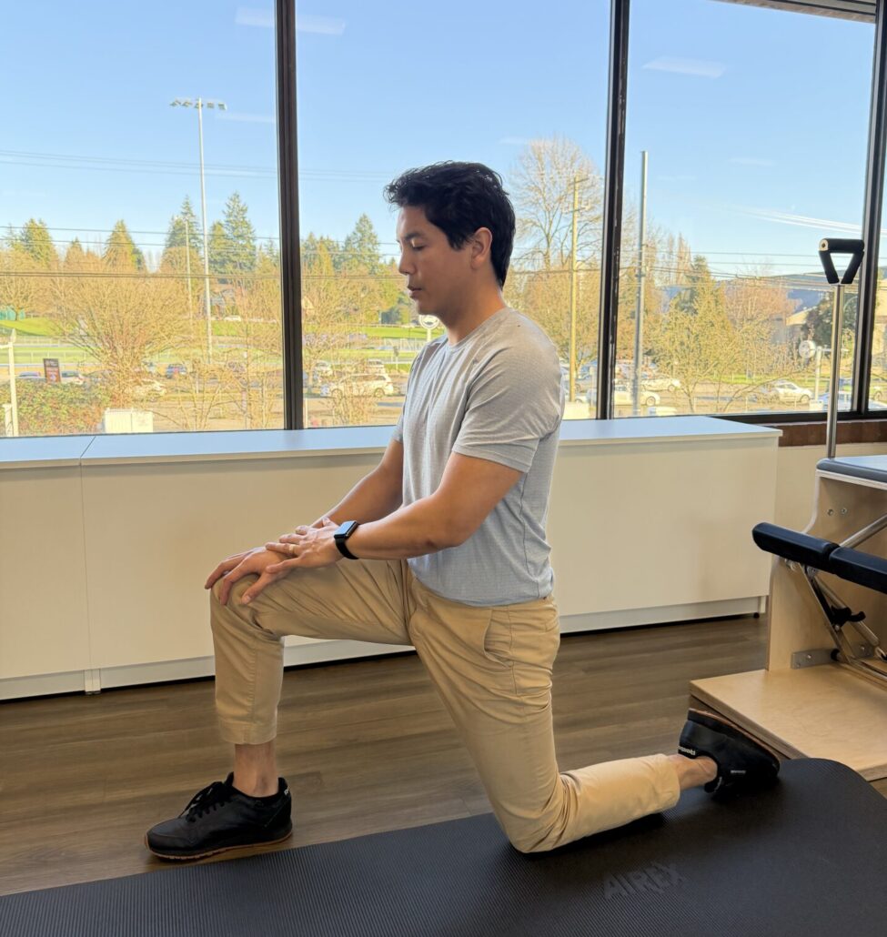 - Stretching during playtime: Use a half-kneeling position to stretch hip flexors while keeping your core engaged while staying at eye level height with your kids.