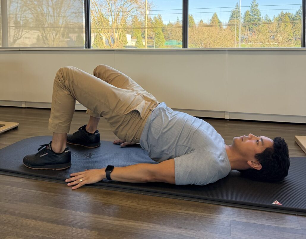 Strengthening: Glute bridges — lie on your back, knees bent, lift hips off the floor, hold 2–3 seconds, repeat 10–15 times.